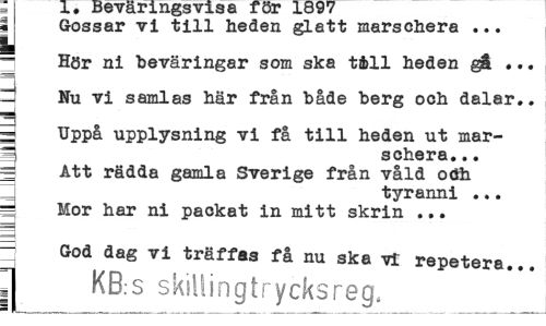 //// i JL . uvvaJ. AiiQoviua J-wi • //// 1 Gossar vi till heden glatt marschera ... //// = Hör ni beväringar som ska till heden gå ... //// 3 Nu vi samlas här från både berg och dalar.. //// i TJppå upplysning vi få till heden ut mar-~ schera... //// g Att rädda gamla Sverige från våld oöh ~ tyranni ... //// 3 Mor har ni packat in mitt skrin ... =i //// God dag vi träffas få nu ska vt repetera... //// [I KB.s skiliingtrycksreg. ////