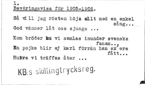 //// 1» //// Beväringsvisa för 1905-1906. //// Så Till jag rösten höja allt med en enkel //// sång... //// God vänner låt oss sjunga ... //// Kom "bröder liu vi samlas inunder svenska //// fanan..; //// In pojke blir ej karl förrän han ex era //// fått... //// Hufcra vi träffas åter ... //// KB:S skiliingtrycksreg. ////