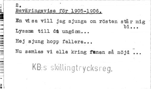 //// I 2. //// U Beväringsvisa för 1905-1906. //// - En -visa vill jag sjunga om rösten står mig T bi... //// ? Lyssna till ål ungdam... //// 3 //// g Hej sjung hopp fallera... //// m Nu samlas vi alla kring fanan så nöjd ... //// -i //// | KB:s skiliingtrycksreg, //// I //// ^ i ////