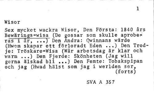 //// 1 //// Wisor //// Sex mycket wackra Wisor, Den Första: 1840 års Bewärings=wisa (De gossar som skulle aprobe-ras i är, ...) Den Andra: Qwinnans wärde (Hwem skapar ett förloradt Eden ...) Den Tredje: Tröskare=Wisa (Wår arbetsdag är klar och warm ...) Den Fjerde: Skönheten (Jag will gerna älskad bli ...) Den Femte: Tobakspipan och jag (Hwad hälst som jag i werlden ser, //// (forts) //// SVA A 35 7 ////