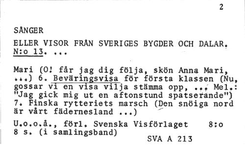 //// z //// sånger //// ELLER VISOR FRÄN SVERIGES BYGDER OCH DALAR. N:o 13. .,. //// Mari (0.' får jag dig följa, skön Anna Mari, //// 6. Beväringsvisa för första klassen (Ny, gossar vi en visa vilja stämma opp, ... Mel.: "Jag gick mig ut en aftonstund spatserande") 7. Finska rytteriets marsch (Den snöiga nord är vårt fädernesland ...) //// U.o.o.å., förl, Svenska Visförlaget 8:o //// 8 s. (i samlingsband) //// SVA A 213 ////