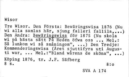 //// Wisor //// Tre Wisor. Den Första: Bewäringswisa 1876 (Nu wi alla samlas här, sjung falleri fallila,...) Den Andra: Bewäringswisa för 18 75 (Nu skola wi på bästa sätt Pa Heden öfwa oss ... Mel.: Så lunkom wi så småningom", ...) Den Tredje: Kommenderingswisa (Året sjuttifyra uti Augusti war, ... Mel.:"Bland wårens de sköna", ...) //// Köping 1876, tr. J.F. Säfberg //// 8 s. 8:o //// SVA A 174 ////