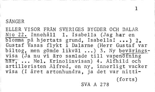 //// 1 //// SÅNGER //// ELLER VISOR FRÅN SVERIGES BYGDER OCH DALAR N:o 22. Innehåll 1. Isabella (Jag har en blomma på hjertats grund, Isabella! ...) 2* Gustaf Vasas flykt i Dalarne (Herr Gustaf var biltog, men gömde likväl ...) 3. Ny beväringsvisa (Ja nu vi äro samlade till vapenöfning lTctY, ... Mel. Krinolinvisan) 4. Alfhild och artilleristen Alfred, en ny, innerligt vacker visa (I året artonhundra, ja det var nitti- //// (forts) //// SVA A 2 78 ////