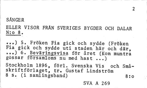 //// 2 //// SÅNGER //// ELLER VISOR FRÅN SVERIGES BYGDER OCH DALAR N:o 8. //// ...) 5. Fröken Fia gick och sydde (Fröken Fia gick och sydde uti staden här och där, ...) 6. Beväringsvisa för året (Kom muntra gossar församloms nu med hast ...) //// Stockholm 1896, förl. Svenska Vis och Små- //// skriftförlaget, tr. Gustaf Lindström //// 8 s. (i samlingsband) 8:o //// SVA A 269 ////