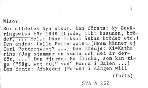//// 1 //// Wisor //// Sex alldeles Nya Wisor. Den första: Ny Bewä-ringswisa för 1898 (Ljude, likt basunen,"~5ro-der, 7.Mel,: Dåne liksom åskan bröder etc.) Den andra: Calle Petterqwist (Hwem känner ej Carl Petterqwist? ...) Den tredje: Ki=Katha rina (Jag stammar en smula och det är der-för, ...) Den fjerde: En flicka, som kan tiga ("Säg, wet du," sad"' Hanna i Dalen ...) Den femte: Afskedet (Farwäl i sången will //// (forts) //// SVA A 252 ////