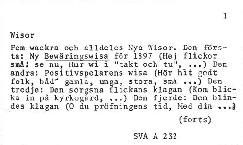 //// 1 //// Wisor //// Fem wackra och alldeles Nya Wisor. Den första: Ny Bewäringswisa för 1897 (Hej flickor små] se nu, Hur wi i "takt och tu", ...) Den andra: Positivspelarens wisa (Hör hit godt folk, båd"* gamla, unga, stora, små .,.) Den tredje: Den sorgsna flickans klagan (Kom blicka in pa kyrkogård, • ••) Den fjerde: Den blindes klagan (0 du pröfningens tid, Med din //// (forts) //// SVA A 232 ////