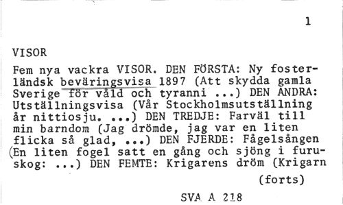 //// 1 //// VISOR //// Fem nya vackra VISOR. DEN FÖRSTA: Ny fosterländsk beväringsvisa 189 7 (Att skydda gamla SverigeTETr*vald och tyranni ...) DEN ANDRA: Utställningsvisa (Vår Stockholmsutställning år nittiosju. ...) DEN TREDJE: Farväl till min barndom (Jag drömde, jag var en liten flicka så glad, ...) DEN FJERDE: Fågelsången (En liten fogel satt en gång och sjöng i furuskog: ...) DEN FEMTE: Krigarens dröm (Krigarn //// (forts) //// SVA A 218 ////