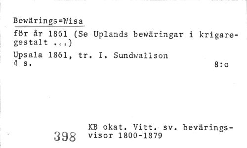 //// Bewärings=Wisa //// för år 1861 (Se Uplands bewäringar i krigaregestalt . //// Upsala 1861, tr. I. Sundwallson 4 s. 8: o //// 379 KB okat. Vitt. sv. bevärings- //// vi.sor 1800-18 79 ////