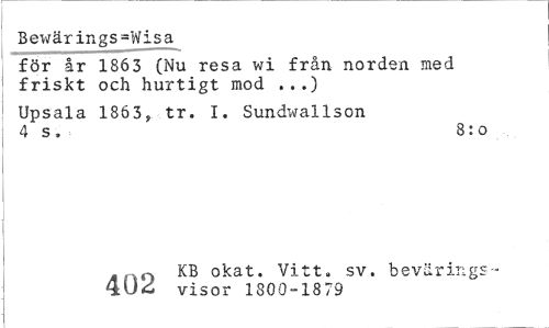 //// Bewär ings=Wisa //// för år 1863 (Nu resa wi från norden med friskt och hurtigt mod ...) //// Upsala 1863, tr. I. Sundwallson 4 s. 8:o //// I //// . nn KB okat. Vitt. sv. bevärings- //// 4U<i visor 1800-1879 ////