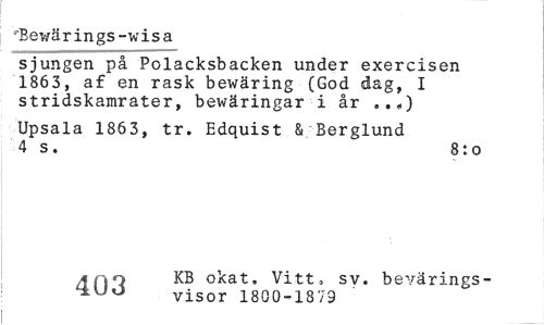 //// "Bewä rings - w i s a //// sjungen på Polacksbacken under exercisen 1863, af en rask bewäring (God dag, I stridskamrater, bewäringar i år ..„) //// Upsala 1863, tr. Edquist & Berglund 4 s. 81 o //// a no KB okat. Vitt , sv. bevärings- //// 4-uo visor 1800-1879 ////
