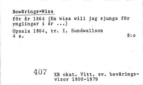 //// Bewärings*Wisa //// för år 1864 (En wisa will jag sjunga för ynglingar i år ...) //// Upsala 1864, tr. I. Sundwallson 4 s. 8:o //// i±iJ ' KB okat. Vitt. sv. bevärings- //// visor 1800-1879 ////