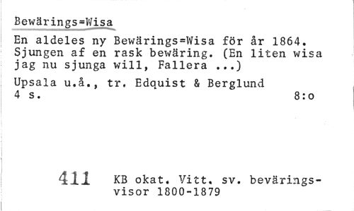 //// Bewärings=Wisa //// En aldeles ny Bewärings=Wisa för år 1864. Sjungen af en rask bewäring. (En liten wisa jag nu sjunga will, Fallera ...) //// Upsala u.å., tr. Edquist & Berglund 4 s. 8:0 //// 379 KB okat. Vitt. sv. bevärings- //// vi.sor 1800-18 79 ////