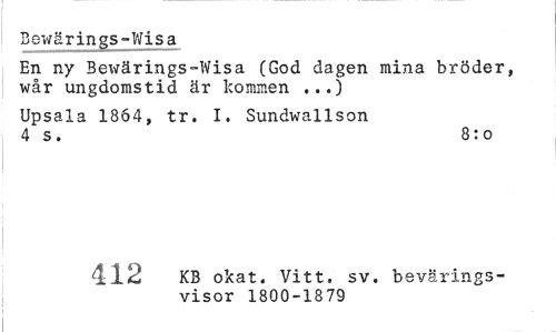 //// Bewärings- Wis a //// En ny Bewärings-Wisa (God dagen mina bröder, wår ungdomstid är kommen ,..) //// Upsala 1864, tr. I. Sundwallson 4 s. 8:0 //// i±iJ ' KB okat. Vitt. sv. bevärings- //// visor 1800-1879 ////