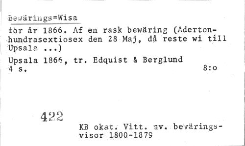 //// £ev/ärings=Wisa //// för år 1866, Af en rask bei^äring (Aderton-hundrasextiosex den 28 Maj, då reste wi till Upsala ,..) //// Upsala 1866, tr. Edquist & Berglund 4 s. 8: o //// 422 //// KB okat. Vitt. sv. bevärings- //// visor 1800-1879 ////