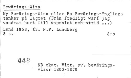 //// Bewärings-Wisa //// Ny Bewärings-Wisa eller En Bewärings=Ynglings tankar på lägret (Från fredligt wärf jag vandrat bort Till wapenlek och strid ,,,) //// Lund 186 8, tr. N.P. Lundberg 8 s. 8:0 //// 448 //// KB okat» Vitt» sv, bevärings- //// visor 1800-1879 ////