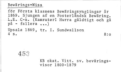 //// Bewärings=Wisa //// för Första klassens Bewäringsynglingar år 1869. Sjungen af en Fosterländsk Bewäring. L.E. C-n. (Kamrateri Hurra gäldtigt och gå på - fallera ,,.) //// Upsala 1869, tr. I. Sundwallson 4 s. 8:o //// 453 //// i±iJ ' KB okat. Vitt. sv. bevärings- //// visor 1800-1879 ////