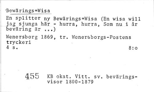 //// •Bewärings =Wis a //// En splitter ny Bewärings=Wisa (En wisa will jag sjunga här - hurra, hurra, Som nu i år beväring är ,».) //// Wenersborg 1869, tr. Wenersborgs-Postens tryckeri //// 4 s. 8:0 //// z-r>n KB okat. Vitt. sv. bevärings //// visor 1800-1879 ////
