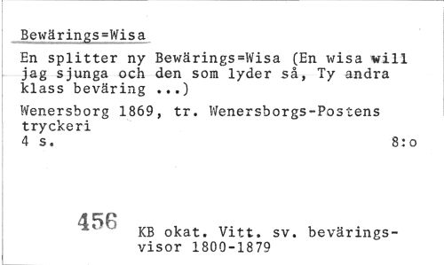 //// En splitter ny Bewärings=Wisa (En wisa will jag sjunga och den som lyder så, Ty andra klass beväring ...) //// Wenersborg 1869, tr. Wenersborgs-Postens tryckeri //// 4 s. 8:0 //// J77 KB okat, Vitt. sv. bevärings- //// - : ' visor 1800-1879 ////