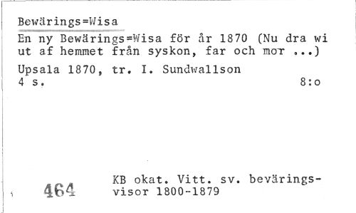 //// Bewärings=Wisa //// En ny Bewärings-Wisa för år 1870 (Nu dra wi ut af hemmet från syskon, far och moT ,..) //// Upsala 1870, tr. I. Sundwallson 4 s. 8:o //// J77 KB okat, Vitt. sv. bevärings- //// - : ' visor 1800-1879 ////