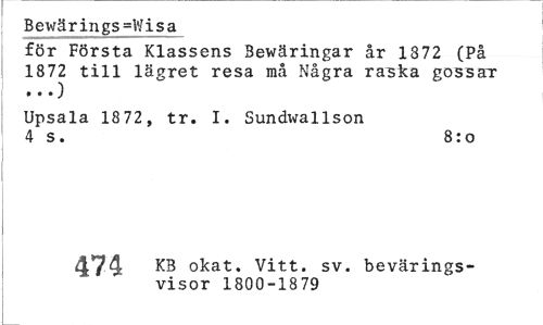 //// Bewärings-Wisa //// för Första Klassens Bewäringar år 1372 (På 1872 till lägret resa må Några raska gossar //// Upsala 18 72, tr. I. Sundwallson 4 s. 8:o //// z-r>n KB okat. Vitt. sv. bevärings //// visor 1800-1879 ////