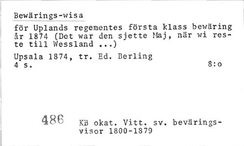 //// Bewärings-wisa //// för Uplands regementes första klass bewäring år 1874 (Det war den sjette Maj, när wi reste till Wessland ..«,) //// Upsala 1874, tr. Ed. Berling 4 s. 8:o //// z-r>n KB okat. Vitt. sv. bevärings //// visor 1800-1879 ////