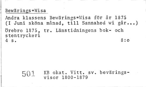 //// Bewärings=Wisa //// Andra klassens Bewärings=Wisa för år 1875 (I Juni sköna månad, till Sannahed v/i går...) //// Örebro 1875, tr. Länstidningens bok- och stentryckeri //// 4 s. 8:o //// J77 KB okat, Vitt. sv. bevärings- //// - : ' visor 1800-1879 ////