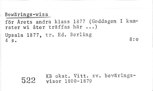 //// Bewärings-wisa //// wumiKH (fiw HWTIB--jfc----... ¦ ¦ ¦ 1 ¦¦ //// för Årets andra klass 1877 (Goddagen I kamrater wi åter träffas här ...) //// Upsala 1877, tr. Ed. Berling 4 s. 8:o //// r. „ 0 KB okat. Vitt. sv. bevärings- //// b4o visor 1800-1879 ////