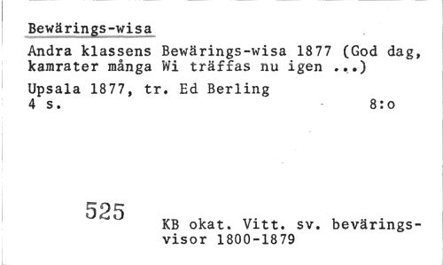 //// Bewärings-wisa //// Andra klassens Bewärings-wisa 18 77 (God dag, kamrater många Wi träffas nu igen ...) //// Upsala 1877, tr. Ed Berling 4 s. 8:o //// 525 //// KB okat. Vitt. sv. bevärings- //// visor 1800-1879 ////