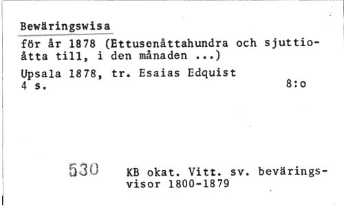 //// Bewäringswisa //// för år 1878 (Ettusenåttahundra och sjuttioåtta till, i den månaden ...) //// Upsala 18 78, tr. Esaias Edquist 4 s. 8:o //// crcrn KB okat. Vitt. sv. bevärings- //// visor 1800-1879 ////