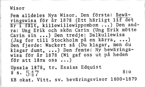 //// Wisor //// Fem alldeles Nya Wisor. Den första: Bewäringswisa för år 1878 (Ett härligt lif det är i fält, killewillewippombom ...) Den andra: Ung Erik och skön Carin (Ung Erik mötte Carin sin ...) Den tredje: Dalkullewisa (Jag for till Stockholm på en kärra, ...) Den fjerde: Wackert så (Du klagar, men du klagar dumt, ...) Den femte: Ny bewäringswisa för år 1878 (Wi gaf oss ut på heden för att lära oss ...) //// Upsala 1878, tr. Esaias Edquist 8 s. 547 8:o //// , kb okat. Vitt. sv. bevärings- //// visor 1880-1939 ////