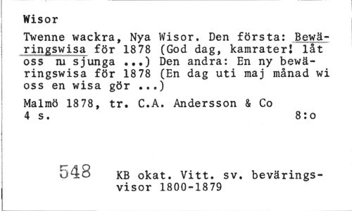 //// Wisor //// Twenne wackra, Nya Wisor. Den första: Bewäringswisa för 1878 (God dag, kamrater! låt oss ni sjunga ...) Den andra: En ny bewäringswisa för 18 78 (En dag uti maj månad wi oss en wisa gör ...) //// Malmö 1878, tr. C.A. Andersson & Co 4 s. 8:o //// crcrn KB okat. Vitt. sv. bevärings- //// visor 1800-1879 ////