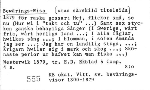 //// Bewärings-Wisa [utan särskild titelsida] //// 1879 för raska gossar: Hej, flickor små, se nu (Hur wi i "takt och tu" ...) Samt sex stycken ganska behagliga Sånger (I Swerige, wårt fria, wårt herliga land I alla fåglar, //// hwilkas sång «..; I blomman, i solen Amanda jag ser ...; Jag har en landtlig stuga, Krigarn hwilar sig i mark och skog , Skönaste perlor ur hafwet kan man fiska .,.) //// Westerwik 1879, tr. E.D. Ekblad & Comp. 4 s. 8: o //// r. „ 0 KB okat. Vitt. sv. bevärings- //// b4o visor 1800-1879 ////