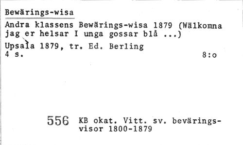//// Bewärings-wisa //// Andra klassens Bewärings-wisa 1879 (Wälkomna jag er helsar I unga gossar blå ...) //// Upsala 1879, tr. Ed, Berling 4 s. 8:o //// crcrn KB okat. Vitt. sv. bevärings- //// visor 1800-1879 ////