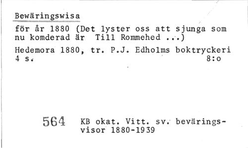 //// Bewäringswisa //// för år 1880 (Det lyster oss att sjunga som nu komderad är Till Rommehed ...) //// Hedemora 1880, tr. P.J. Edholms boktryckeri 4 s, 8:o //// 564 KB okat. Vitt. sv. bevärings- //// visor 1880-1939 ////