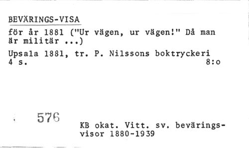 //// BEVÄRINGS-VISA //// för år 1881 ("Ur vägen, ur vägen!" Då man är militär ...) //// Upsala 1881, tr. P. Nilssons boktryckeri 4 s. 8:o //// 576 //// KB okat. Vitt. sv. bevärings- //// visor 1880-1939 ////
