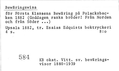 //// Bewäringswisa //// för Första Klassens Bewäring på Polacksbacken 188 2 (Goddagen raska bröder! Från Norden och från Söder ...) //// Upsala 1882, tr. Esaias Edquists boktryckeri 4 s. 8 : o //// ¦ KB okat. Vitt. sv. bevärings- //// visor 1880-1939 ////