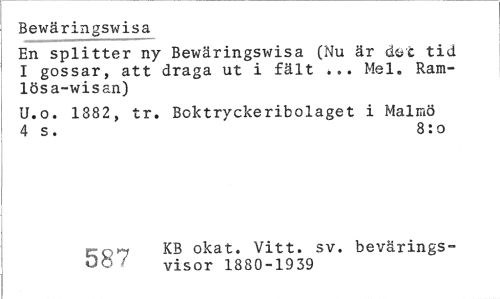 //// Bewäringswisa //// En splitter ny Bewäringswisa (Nu är döt tid I gossar, att draga ut i fält ... Mel. Ram-lösa-wisan) //// U.o. 1882, tr. Boktryckeribolaget i Malmö 4 s. 8:0 //// ero>7 okat. Vitt. sv. bevärings- //// f visor 1880-1939 ////