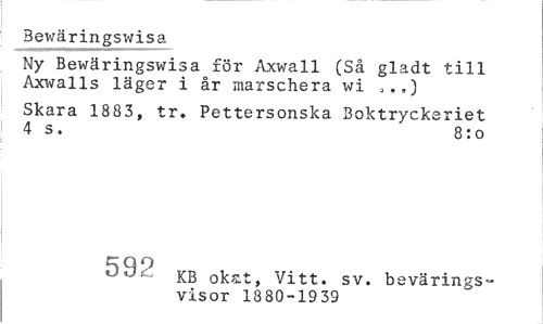 //// Bewäringswisa //// Ny Bewäringswisa för Axwall (Så gladt till Axwalls läger i år marschera wi ,..) //// Skara 1883, tr. Pettersonska Boktryckeriet 4 s. 8:0 //// uuc- KB okat, Vitt. sv. bevärings- //// visor 1880-1939 ////