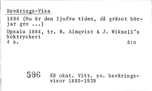 //// Bevärings-Visa //// 1884 (Nu är den ljufva tiden, då gräset bör-j ar gro ...) //// Upsala 1884, tr. R. Almqvist & J. Wiksell's boktryckeri //// 4 s. 8:o //// 596 KB okat. Vitt. sv. bevärings- //// visor .1880-1939 ////