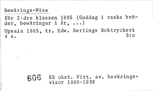 //// Bewärings-Wisa //// för 2:dra klassen 1885 (Goddag i raska bröder, bewäringar i år, ...) //// Upsala 1885, tr. Edw. Berlings Boktryckeri 4 s. 8:o //// 606 KB okat. Vitt. sv. bevärings- //// visor 1880-1939 ////