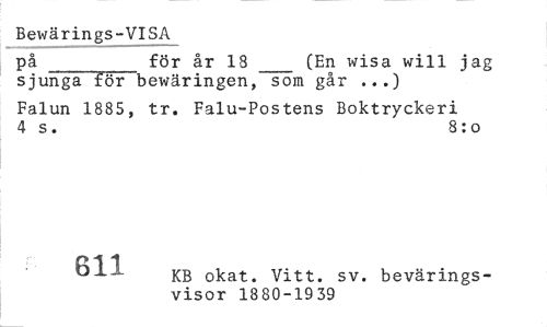 //// Bewärings-VISA //// på _ för år 18 _ (En wisa will jag //// sjunga för bewäringen, som går ...) //// Falun 1885, tr. Falu-Postens Boktryckeri 4 s. 8:o //// 611 KB okat. Vitt. sv. bevärings- //// visor .1880-1939 ////