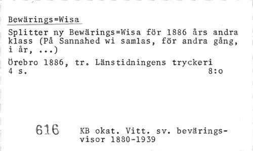 //// Splitter ny Bewärings=Wisa för 1886 års andra klass (På Sannahed wi samlas, för andra gång, i år, ...) //// Örebro 1886, tr* Länstidningens tryckeri 4 s. 8: o //// 61.8 KB okat. Vitt. sv. bevärings- //// visor 1880-1939 ////