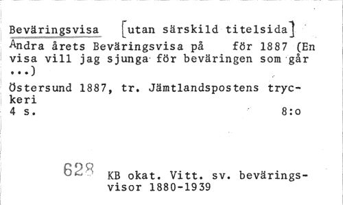 //// Beväringsvisa [utan särskild titelsidaj //// Andra årets Beväringsvisa på för 1887 (En //// visa vill jag sjunga för beväringen som går • • • ] //// Östersund 1887, tr. Jämtlandspostens tryckeri //// 4 s. 8:o //// KB okat. Vitt. sv. bevärings- //// u ' J visor 1880-1939 ////