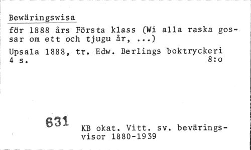 //// Bewäringswisa //// för 1888 års Första klass (Wi alla raska gossar om ett och tjugu år, ...) //// Upsala 1888, tr. Edw. Berlings boktryckeri 4 s. 8: o //// 61.8 KB okat. Vitt. sv. bevärings- //// visor 1880-1939 ////