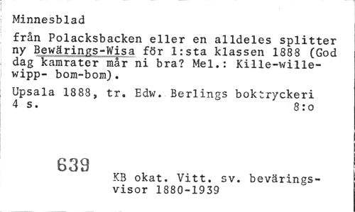 //// Minnesblad //// från Polacksbacken eller en alldeles splitter ny Bewärings-Wisa för l:sta klassen 1888 (God dag kamrater mår ni bra? Mel.: Kille-wille-wipp- bom-bom). //// Upsala 1888, tr. Edw. Berlings boktryckeri 4 s. 8:o //// 639 //// KB okat. Vitt. sv. bevärings- //// visor 1880-1939 ////