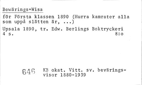 //// Bewärings=Wisa //// för Första klassen 1890 (Hurra kamrater alla som uppå slätten är, ...) //// Upsala 1890, tr. Edw. Berlings Boktryckeri 4 s. 8:o //// p/1^ KB okat. Vitt. sv. bevärings- //// ' visor 1880-1939 ////