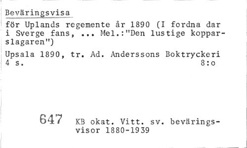 //// Beväringsvisa //// för Uplands regemente år 1890 (I fordna dar i Sverge fans, ... Mel.:"Den lustige kopparslagaren") //// Upsala 1890, tr. Ad. Anderssons Boktryckeri 4 s. 8 :o //// 61.8 KB okat. Vitt. sv. bevärings- //// visor 1880-1939 ////