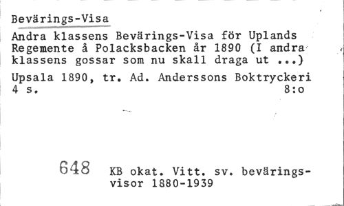 //// Bevärings-Visa //// Andra klassens Bevärings-Visa för Uplands Regemente å Polacksbacken år 1890 (I andra klassens gossar som nu skall draga ut ...) //// Upsala 1890, tr. Ad. Anderssons Boktryckeri 4 s. 8:o //// 61.8 KB okat. Vitt. sv. bevärings- //// visor 1880-1939 ////