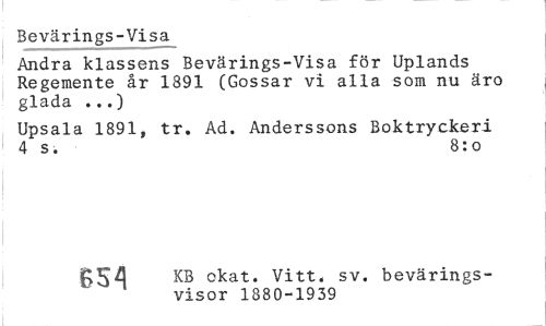 //// Bevärings-Visa //// Andra klassens Bevärings-Visa för Uplands Regemente år 1891 (Gossar vi alla som nu äro glada ...) //// Upsala 1891, tr. Ad. Anderssons Boktryckeri 4 s. 8:o //// KB okat. Vitt. sv. bevärings- //// u ' J visor 1880-1939 ////