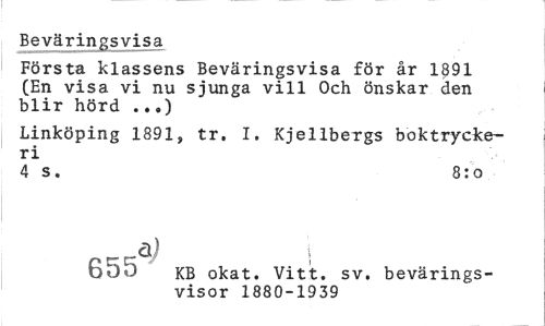 //// Beväringsvisa //// Första klassens Beväringsvisa för år 1891 (En visa vi nu sjunga vill Och önskar den blir hörd ..») //// Linköping 1891» tr. I. Kjellbergs boktryckeri //// 4 s. 8:o //// p/7^ KB okat. Vitt. sv. bevärings- //// ' visor 1880-1939 ////